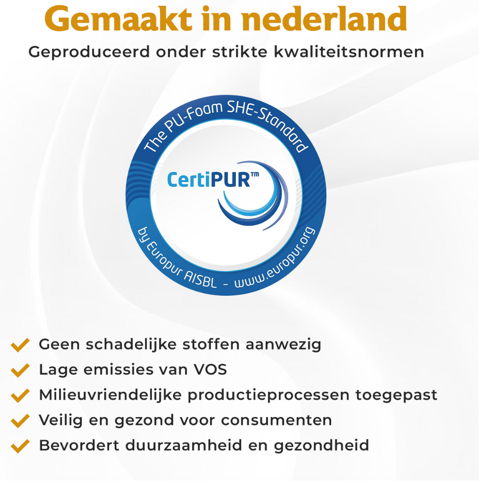 Duurzaam Ontwerp uit Nederland: Ontworpen en vervaardigd in Nederland, garanderen we een kwaliteitsmatras dat lang meegaat.